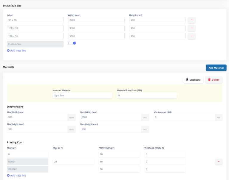 Below is a simple snapshot on how the prices are generated (from PriceCal) based on size: